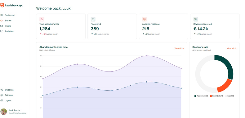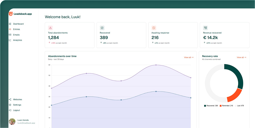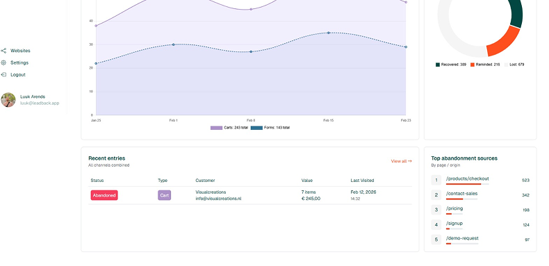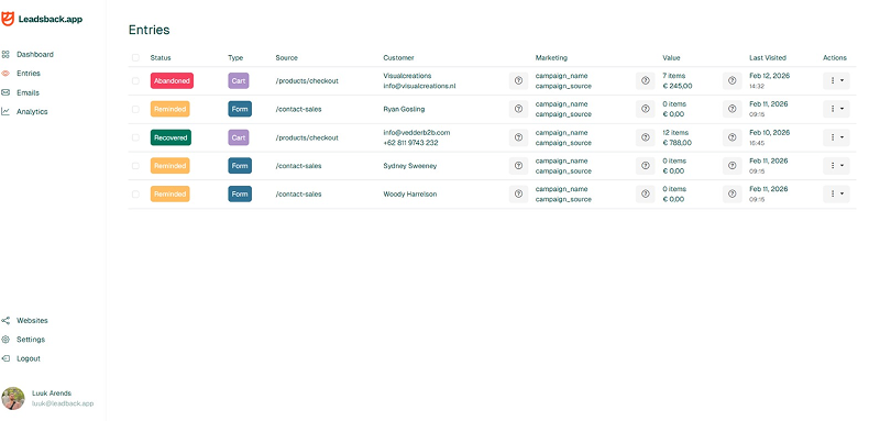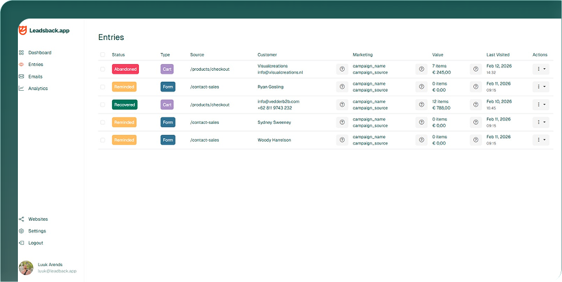 See every abandoned submission in detail. Track status, source URL, customer data, product value, last visit, and recovery actions. All in one clear overview.